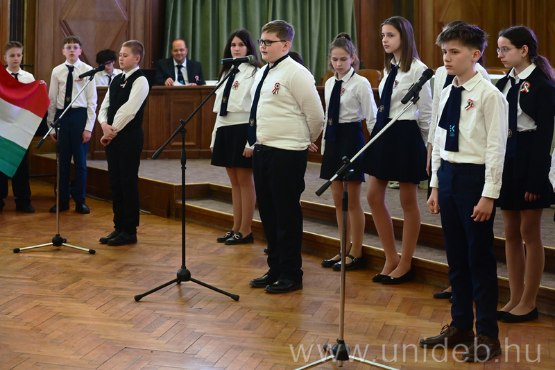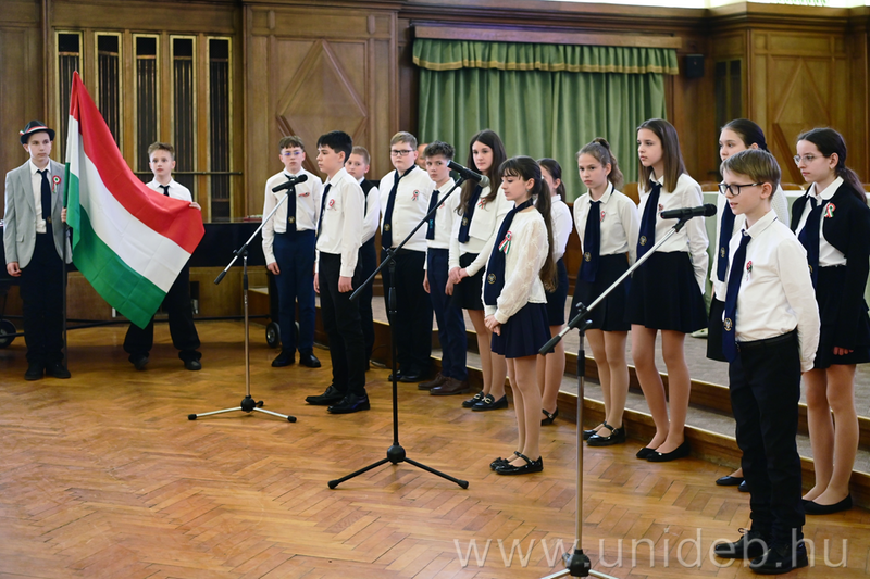 Látványos műsorral és mélyenszántó gondolatokkal tisztelgett az 1848/49-es forradalom és szabadságharc hősei előtt a Debreceni Egyetem Kossuth Lajos Gyakorló Gimnáziuma és Általános Iskolája. A 7. és 8. évfolyamos diákjaink a Debreceni Egyetem Aulájában emlékeztek meg az eseményekről, míg az 1-6. évfolyamosaink egy emlékfilmet tekintettek meg a 3.a osztály előadásában.